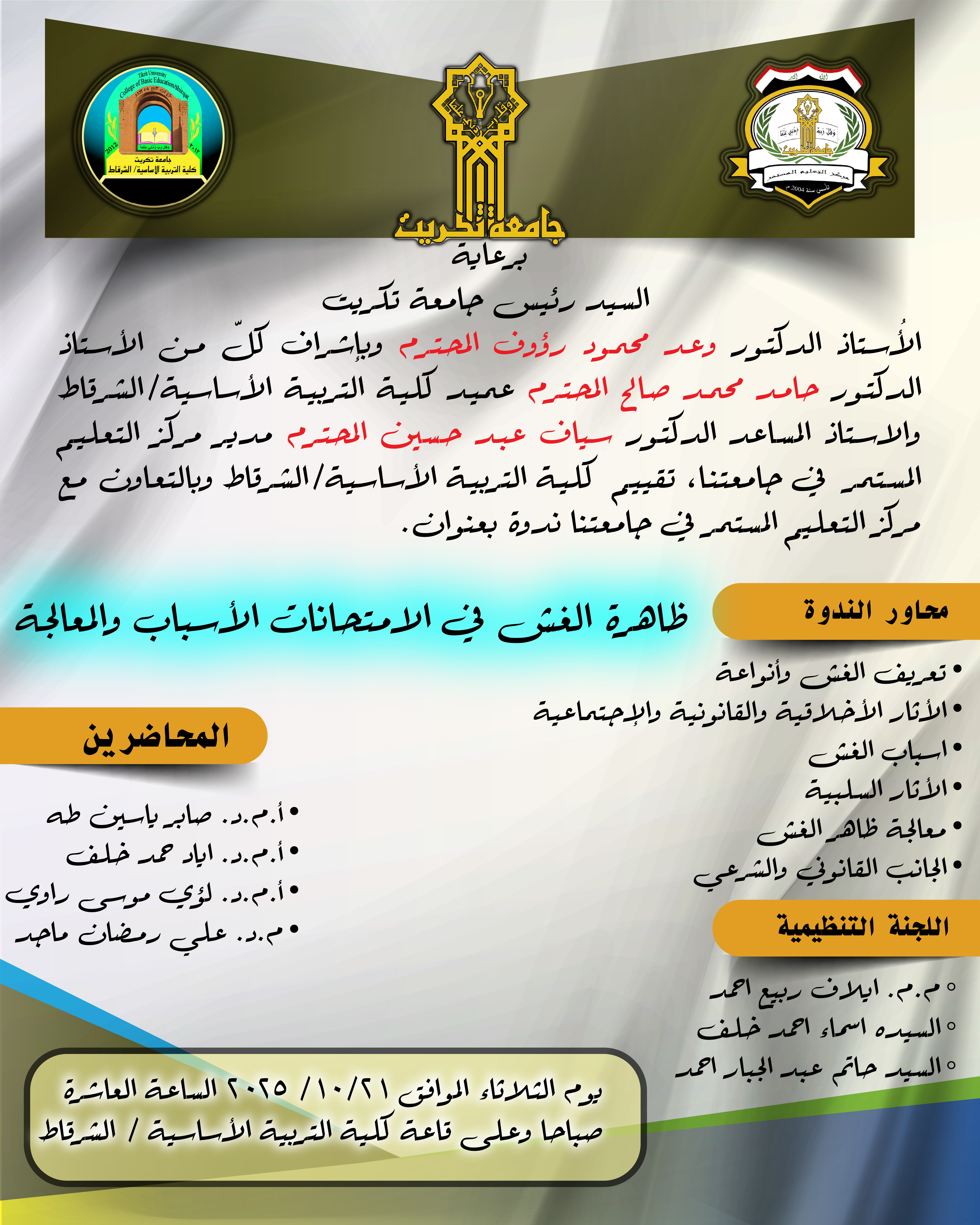 ستقيم كلية التربية الأساسية/الشرقاط ندوة بعنوان (ظاهرة الغش في الامتحانات الأسباب والمعالجة) يوم الثلاثاء الموافق 21/10/2025 وعلى قاعة كلية التربية الأساسية / الشرقاط.