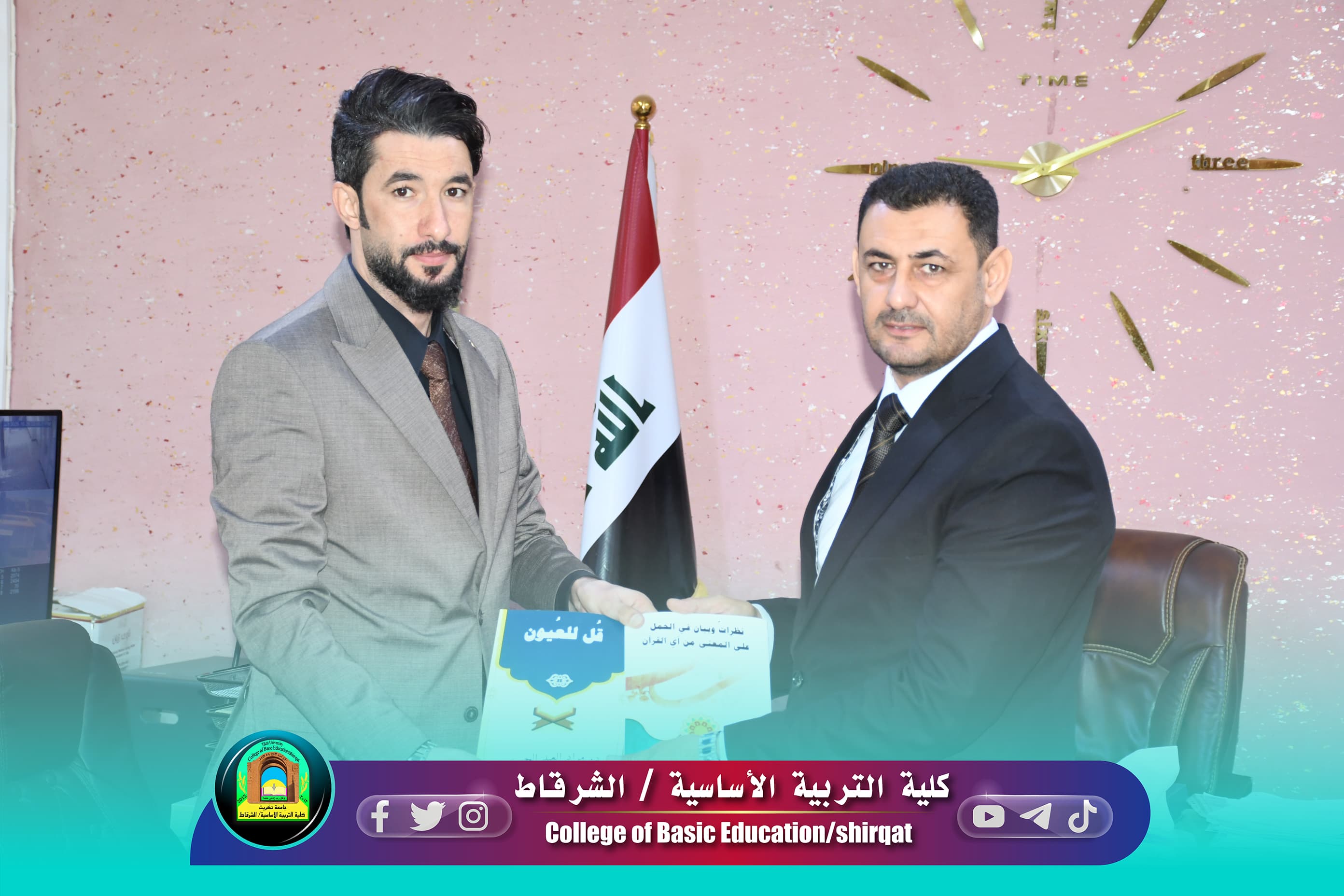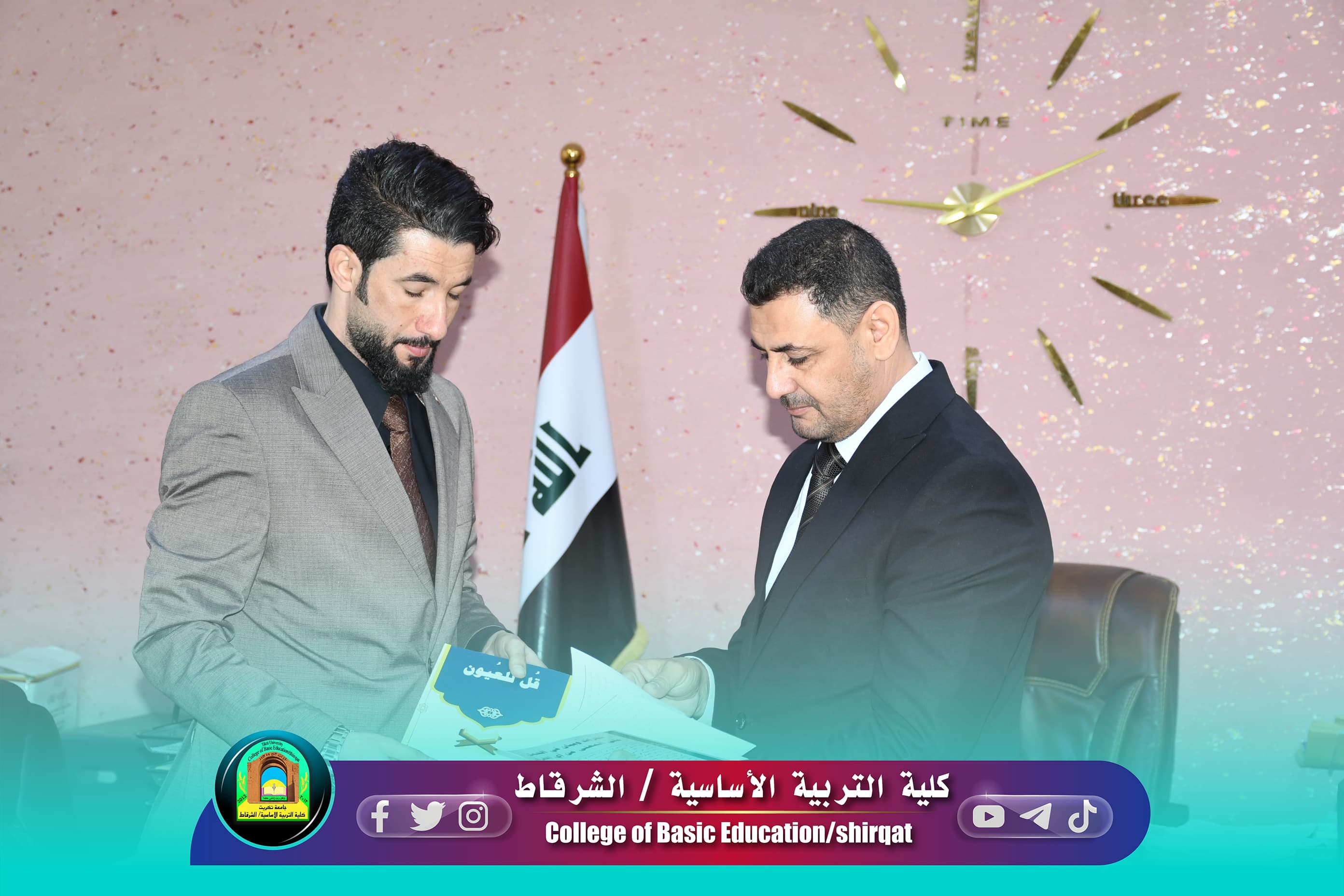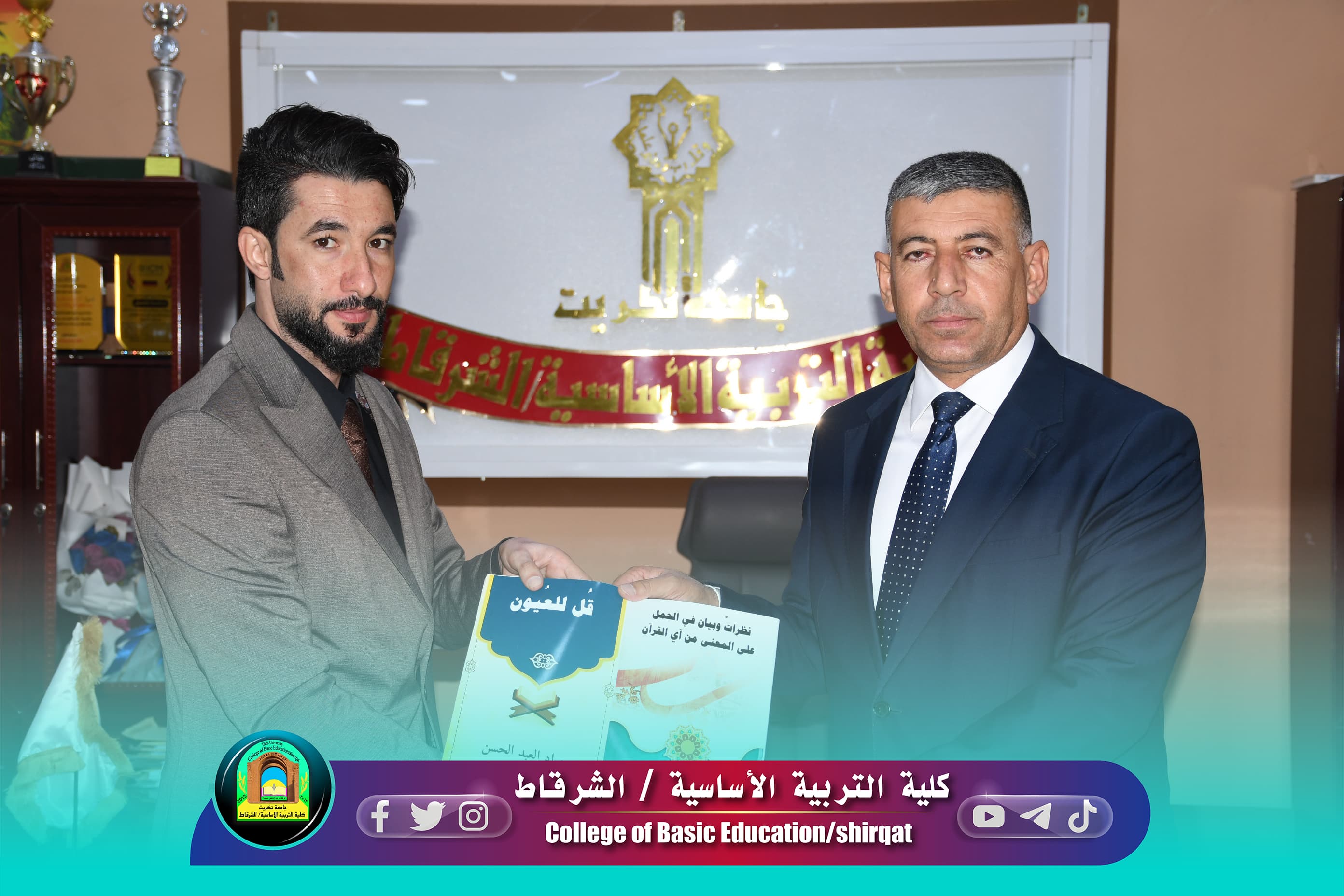 ثمن الأستاذ الدكتور حامد محمد صالح المحترم عميد الكلية جهود التدريسي في قسم اللغة العربية الأستاذ المساعد الدكتور مراد عبد حسين بعد أن أهدى نسخًا من كتابين علميين من تأليفه إلى مكتبة الكلية، أحدهما بعنوان ( نظراتٌ وبيان في الحمل على المعنى من آيِ القرآن)، وهو كتاب ينظر في بلاغة التعبير القرآني ودقة انتقاء الألفاظ، ويكشف عن سر استعمال الجمل والألفاظ التي يُراد بها تعدد المعاني . وقد كشف هذا الكتاب عن أسلوب فني بليغ ، وهو أن يجمع بتعبير واحد معاني متعددة، والآخر بعنوان (قُل للعيون) وهو كتاب يكشف عن جمال ملاحظ العيون ، وعن دور جارحة العين في تشكيل المعاني ، وأناقة العين في رسم المشاهد . وهذان الكتابان صدرا عن دار سومر في قضاء الشرقاط، في خطوة تعكس حرصه على إثراء مكتبة الكلية وخدمة المسيرة الأكاديمية، وقد عبَّر عميد الكلية عن تقديره العميق للجهود البحثية والعلمية للتدريسي، مؤكدًا أن هذا الإنجاز يمثل إضافة نوعية لمكتبة الكلية، ويسهم في توفير مصادر معرفية قيمة للطلاب والباحثين.