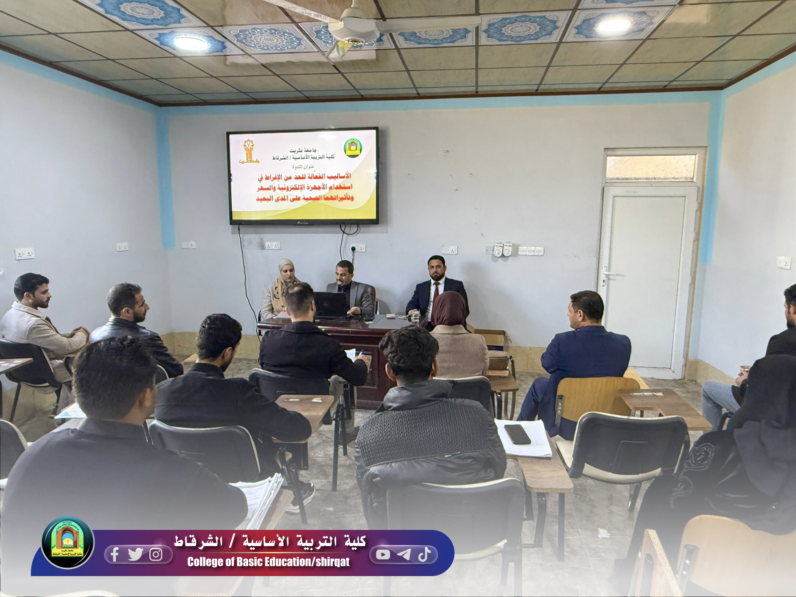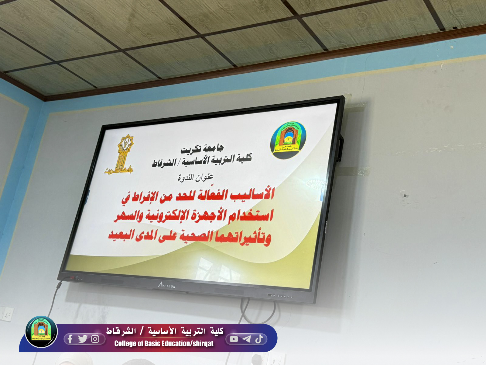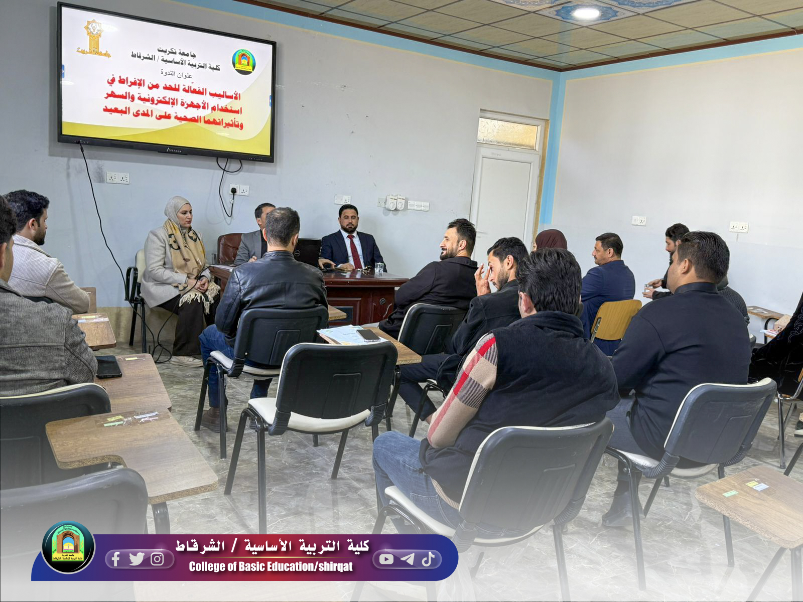 برعاية الأستاذ الدكتور وعد محمود رؤوف رئيس جامعة تكريت وبإشراف الأستاذ الدكتور حسين عبد إسماعيل عميد الكلية أقامت كلية التربية الأساسية / الشرقاط وبالتعاون مع مركز التعليم المستمر ندوة علمية بعنوان ((الأساليب الفعّالة للحد من الإفراط في استخدام الأجهزة الإلكترونية والسهر وتأثيراتهما الصحية على المدى البعيد)) اليوم الثلاثاء الموافق 2026/1/27 إذ حضر الندوة الأستاذ الدكتور سعد جرجيس سعيد معاون العميد للشؤون العلمية وعدد من تدريسيي وطلبة الكلية وقد حاضر في الندوة كل من.